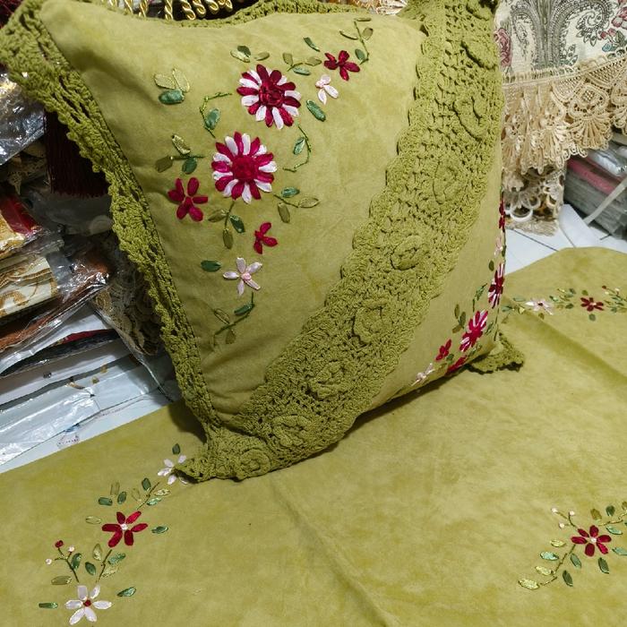SATU SET 5 SARUNG BANTAL+1 TAPLAK MEJA TAMU BORDIR RENDA KERANCANG - 4040 CM COKLAT BELUDRU