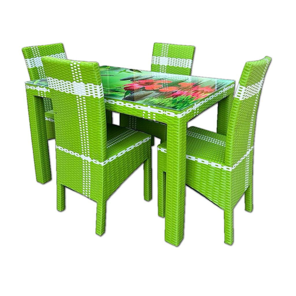Meja Makan Rotan Sintetis 4 Kursi Satu Set | Meja Makan Rotan Minimalis + Kaca Printing Motif | Kursi Makan Rotan