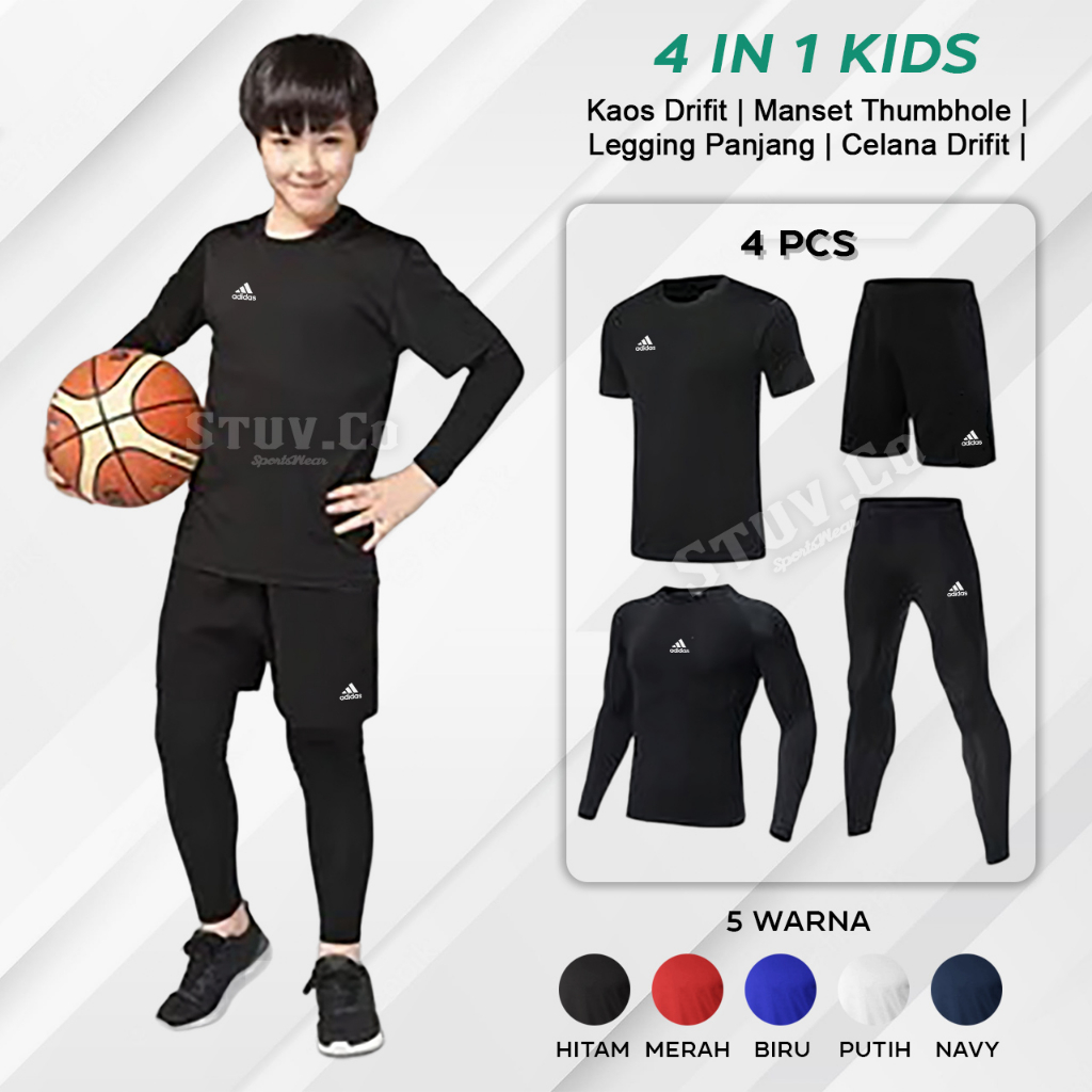 4IN1 STELAN OLAHRAGA ANAK KAOS DRIFIT MANSET BASELAYER THUMBHOLE LEGGING PANJANG DAN CELANA PENDEK UNISEX