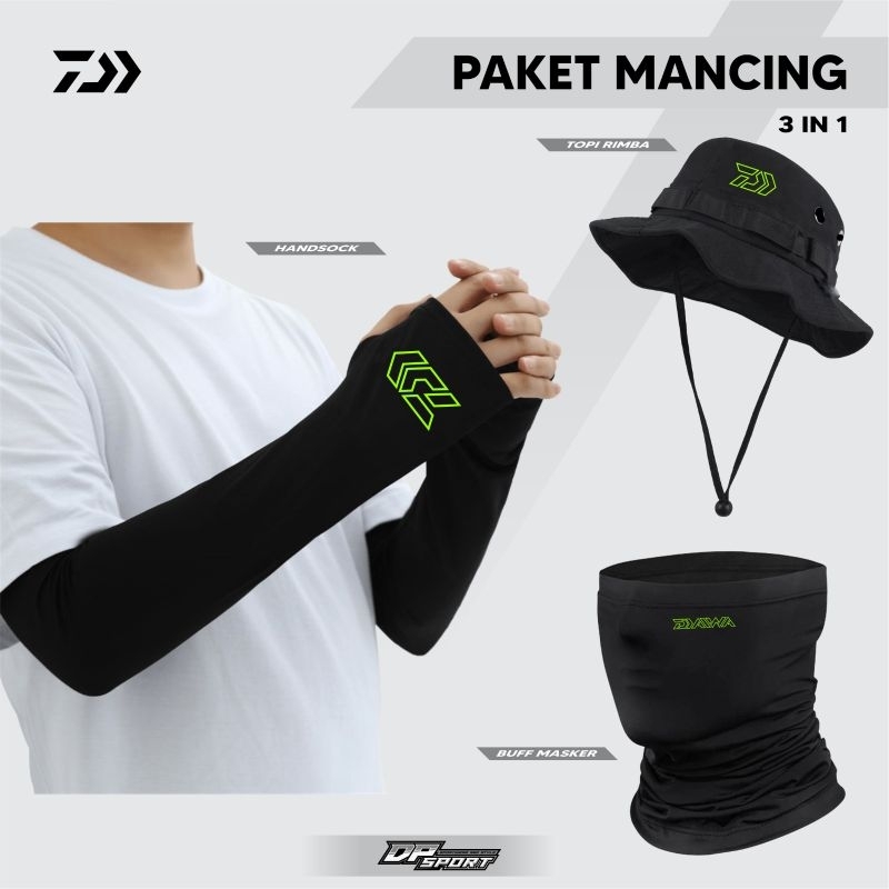 Paket Lengkap Buff Masker Melar Deker Tangan Jempol 2 Pasang Topi Rimba Bahan Kanvas Pria Wanita