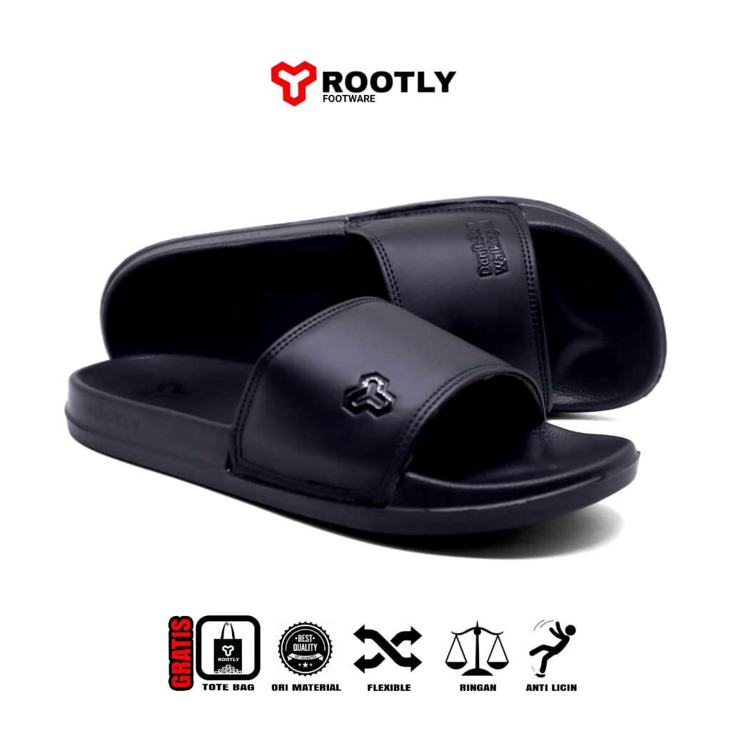 Rootly - Sandal Pria Hitam Polos New Logo Timbul