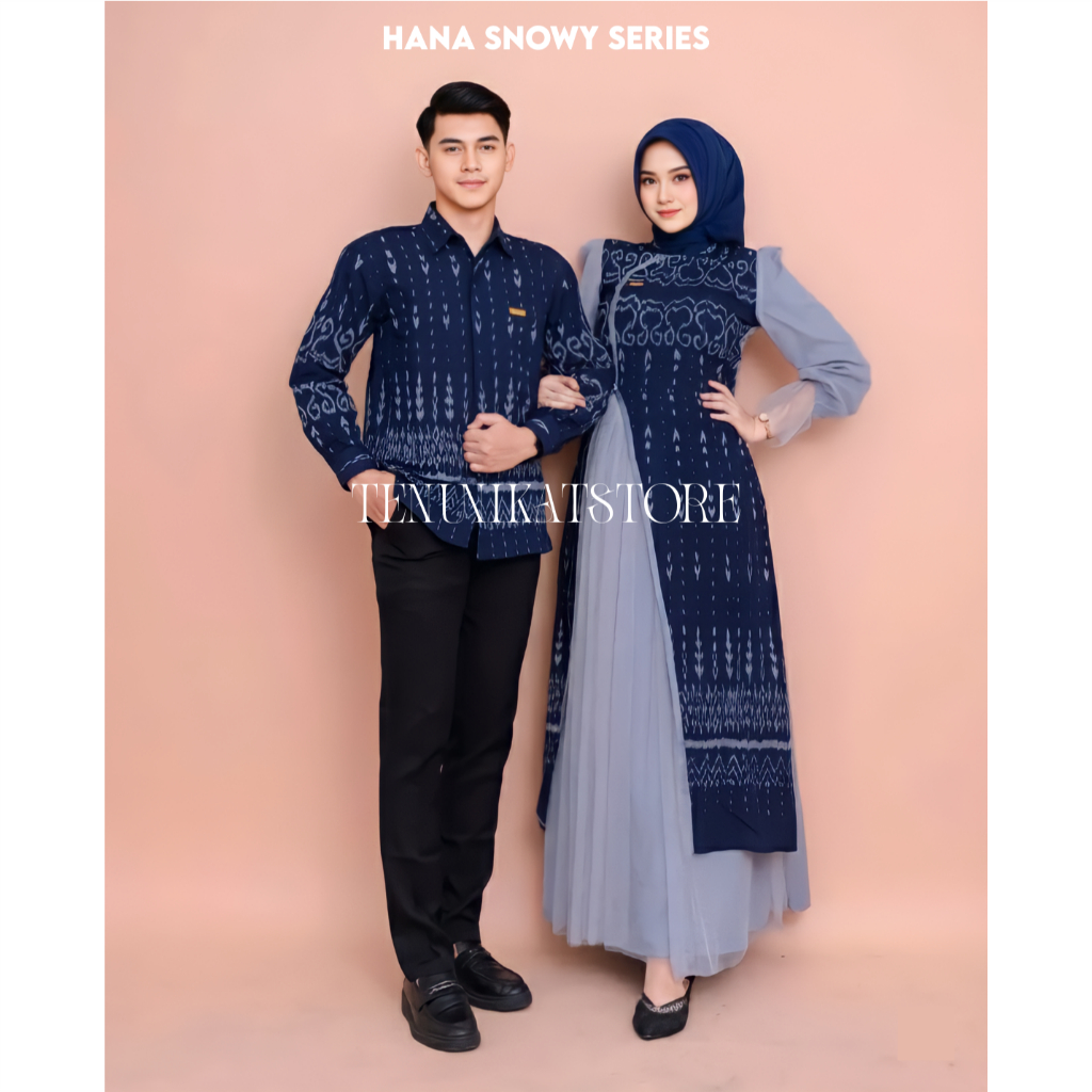 Couple Baju Tenun Hana Navy Set Muslim Kondangan Dress & Kemeja Premium