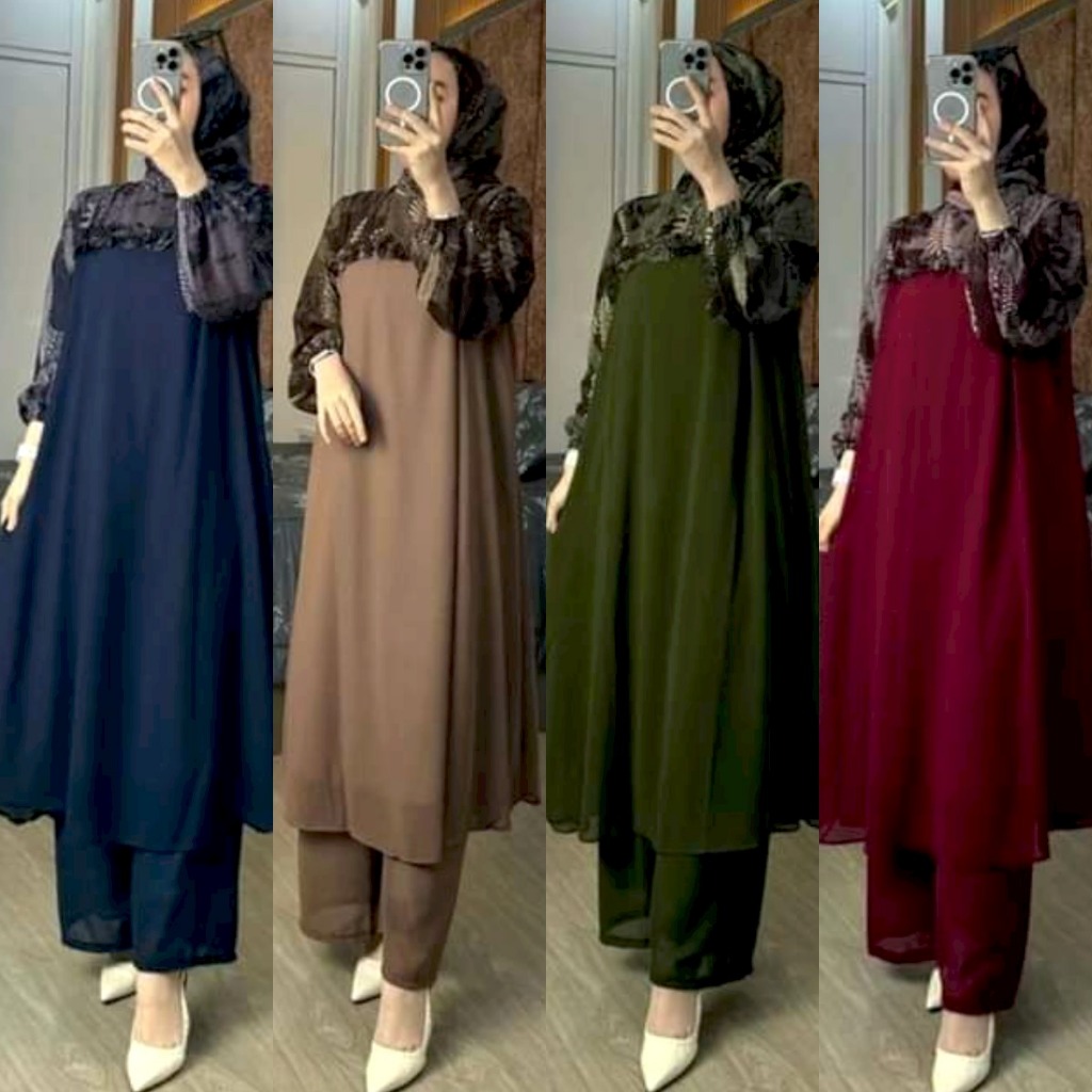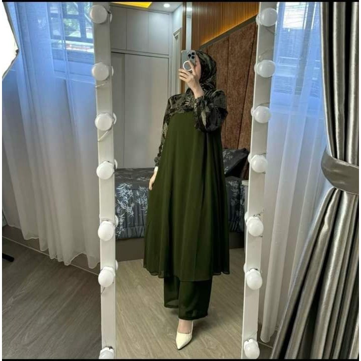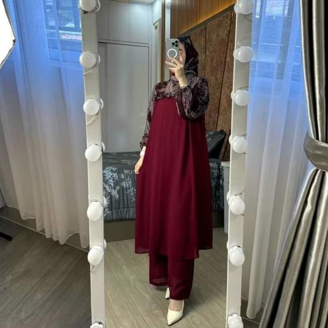 set hijab tunik panjang salma oneset long tunik crinkel wanita setelan jumbo oneset busui 3 in 1