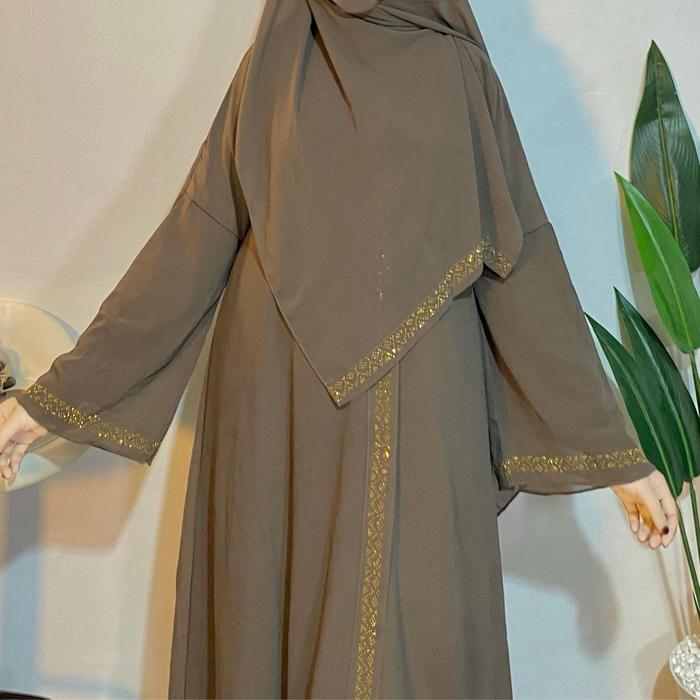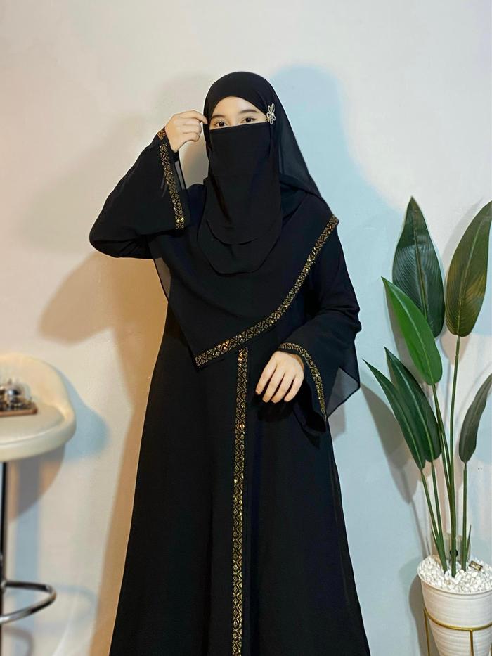 Majidah - Abaya Dubai Dewasa Set Hijab Pashmina Dan Cadar Terbaru 2025 Syari Hiasan Hotfix Manik Ceruti Baby Doll Elegan