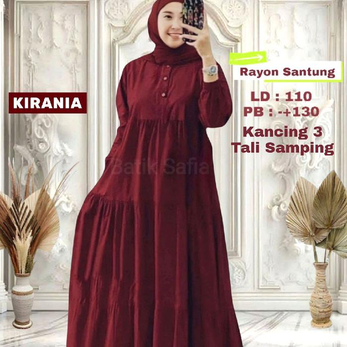 Gamis Kirania Rayon Santung Polos Dress Susun Kancing Pakaian Wanita Fashion Muslim - Maroon, All Size Ld:110
