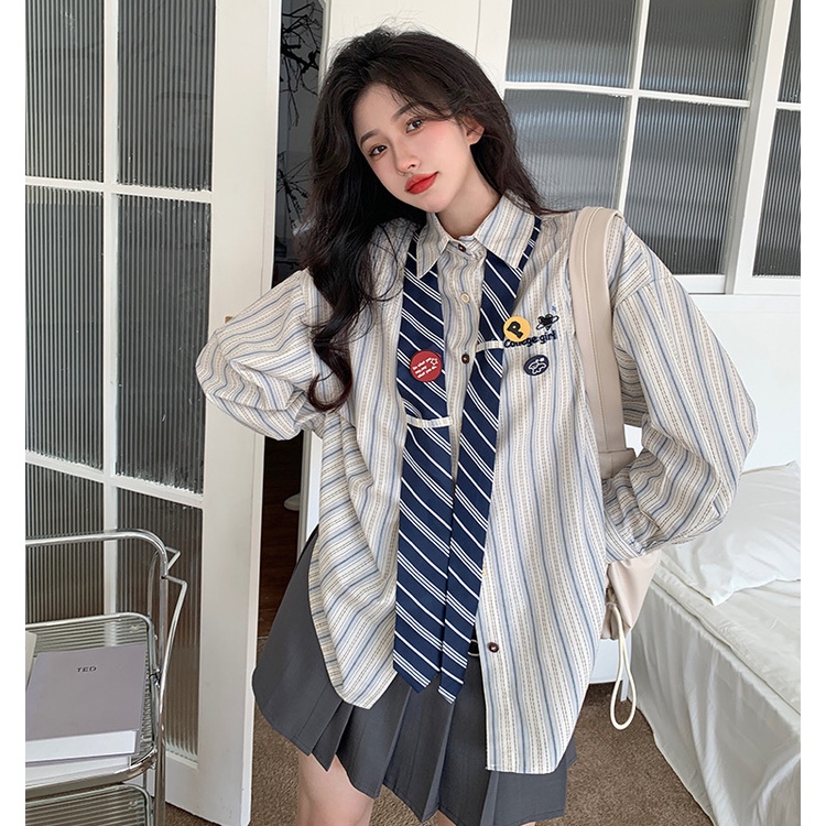 Kemeja Wanita Lengan Panjang Bergaris, Atasan Kemeja Modis Longgar Gaya Korea (Bonus Dasi Lencana)