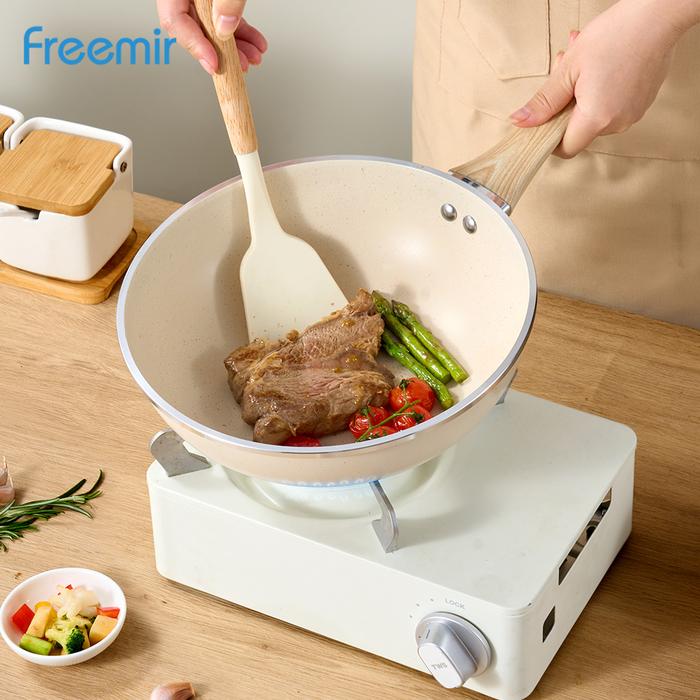 [Crehom] freemir Wajan Penggorengan 24 cm Granit Putih Beige Tutup Kaca Anti Lengket Dapur Panci
