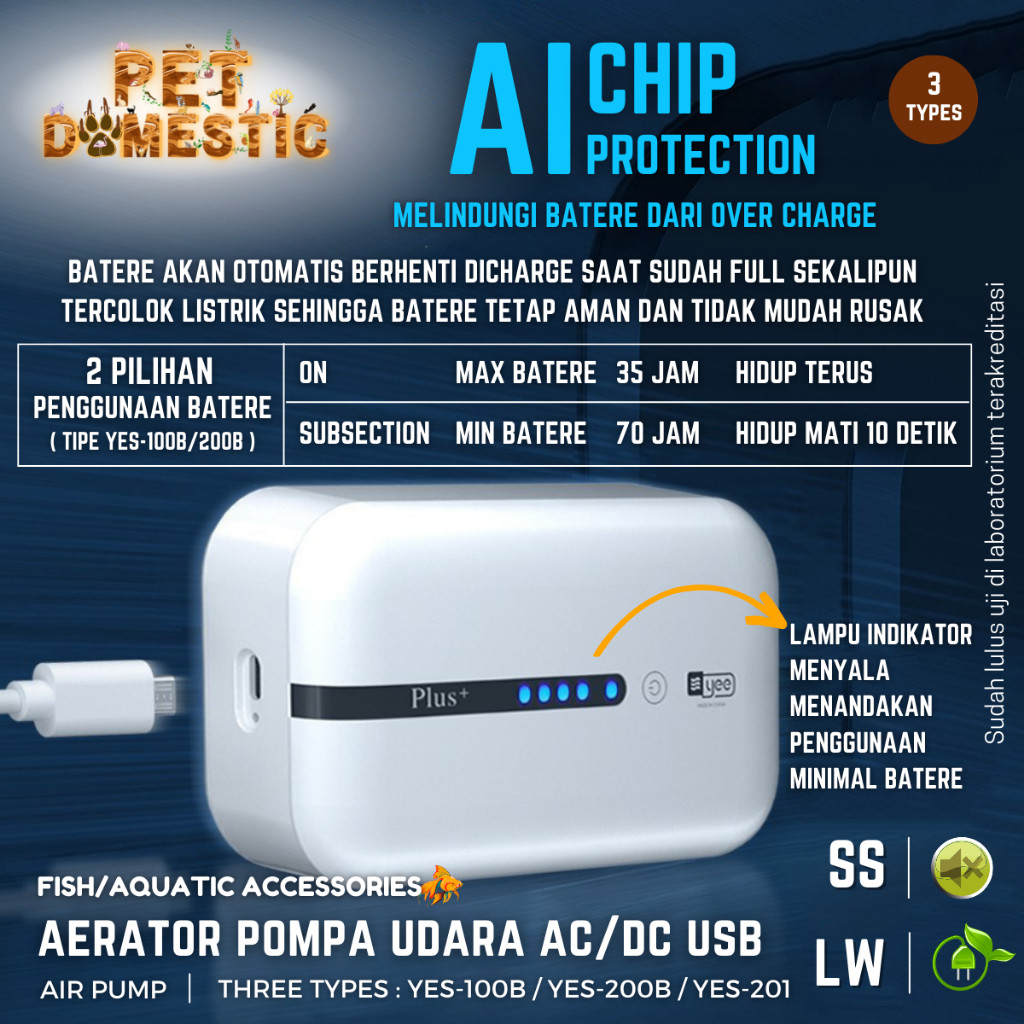 YES Aerator AC DC USB Silent Air Pump Aquarium Pompa Gelembung Udara Oksigen Airator Mancing 1 2 Lubang Cas Baterai Akua