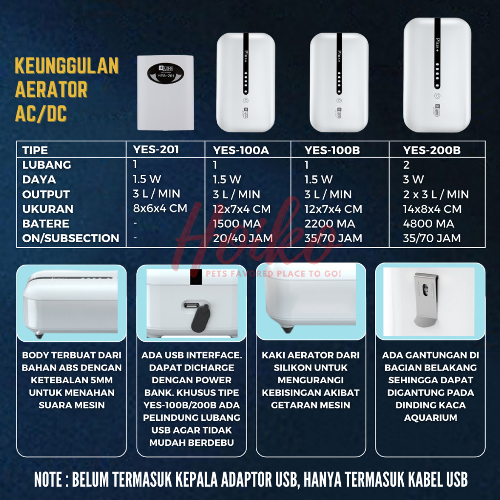 Silent Aerator YES AC DC USB Portable Air Pump Aquarium Pompa Gelembung Udara Oksigen Airator 1 2 Lubang Baterai Cas Aku