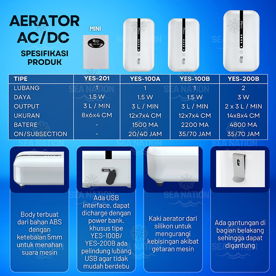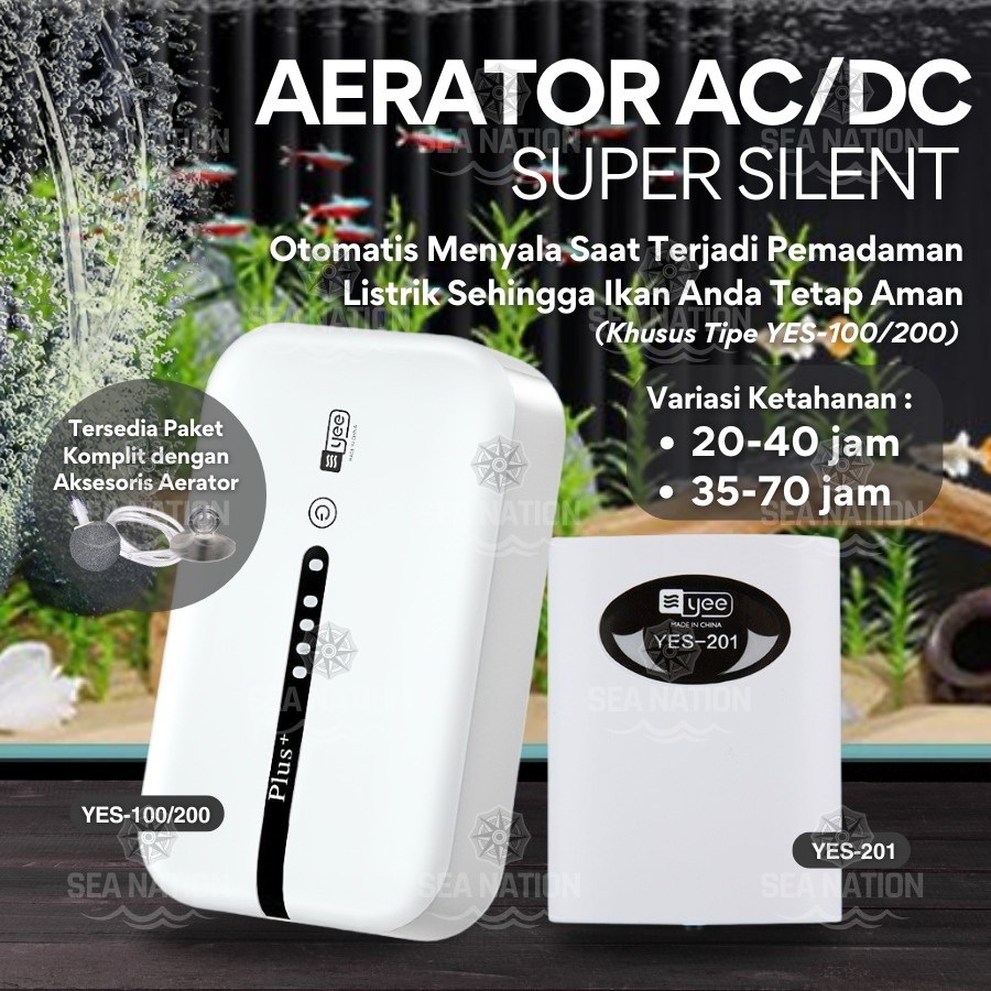 Aerator YES Silent Air Pump AC DC USB Pompa Oksigen Gelembung Udara Airator Mancing 2 Lubang Baterai Cas Aquarium Ikan U