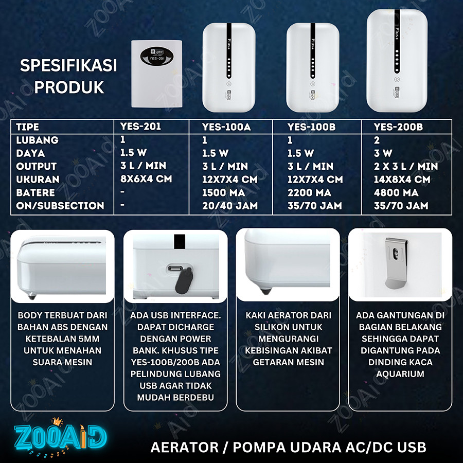 Portable Aerator YES Silent AC DC USB Air Pump Aquarium Gelembung Udara Pompa Oksigen Airator Baterai Otomatis 1 2 Luban