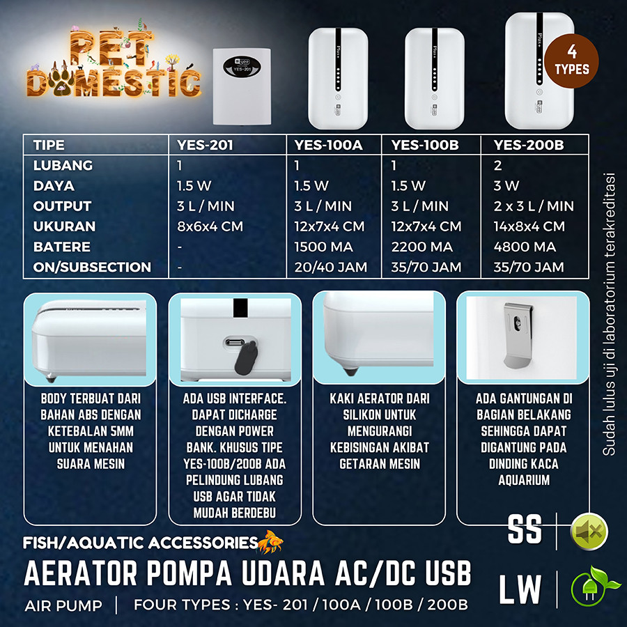 Silent Aerator AC DC USB YES Aquarium Air Pump Pompa Oksigen Gelembung Udara Airator 1 2 Lubang Baterai Mancing Cas Akua