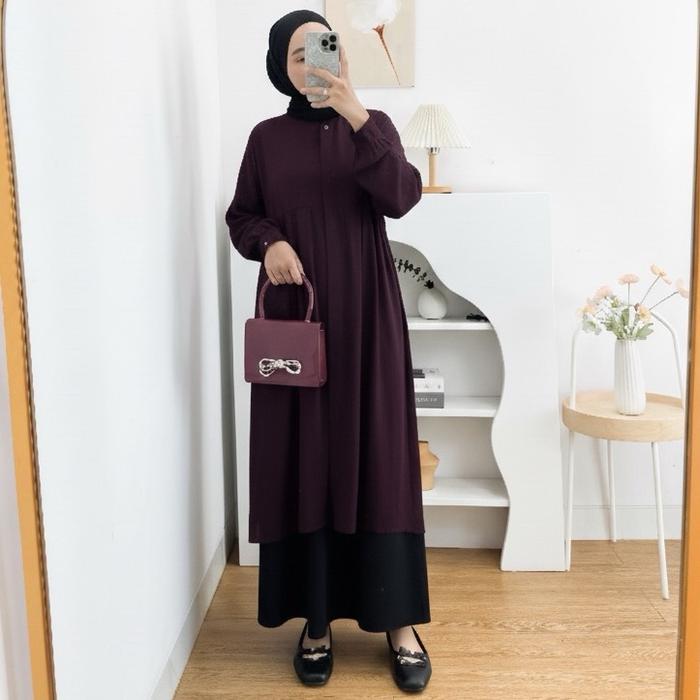 Laura Long Tunik Outer Midi Rayon Polos Dress Kancing Wanita - Beige, L Ld100