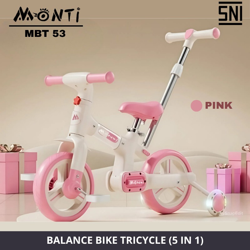 Monti Sepeda Anak Roda 2 Tricycle Balance Bike 5in1 Original MBT 53 - Sepeda Keseimbangan Pink Green Beige SNI