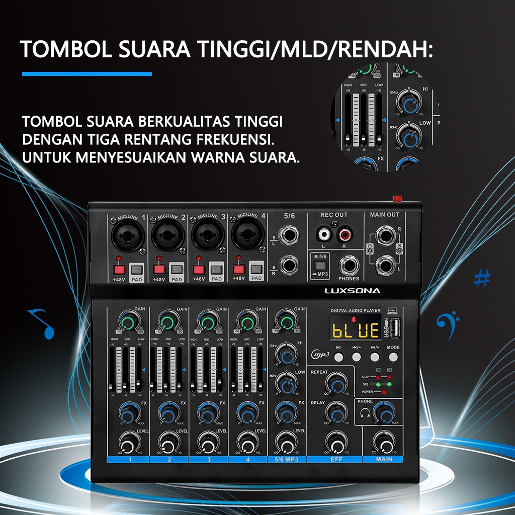 LUXSONA 4/6 mixer profesional/EQ Tiga-Band dengan Reverb/mixer audio murah/mixer profesional USB dengan perekaman bluetooth