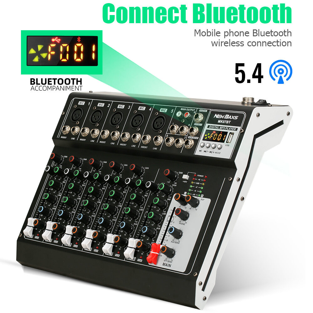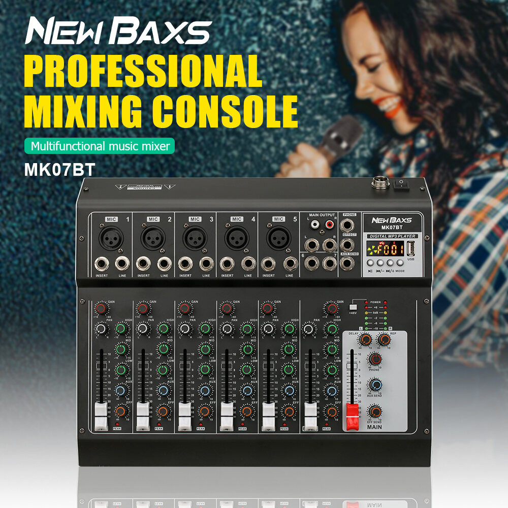 [NEW BAXS Mixer audio mini efek vokal MK07BT] Mixer Profesional 7 Channel - Rekaman Multi Track mixer karaoke | Bluetooth 5.4 + 48V Phantom | USB|MP3|Equalizer Preset STAGE / EVENT MUSIK