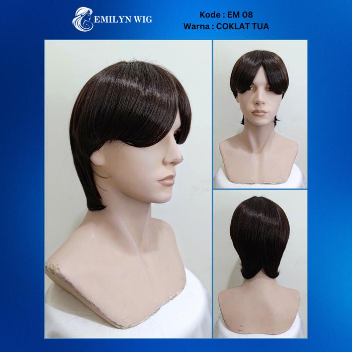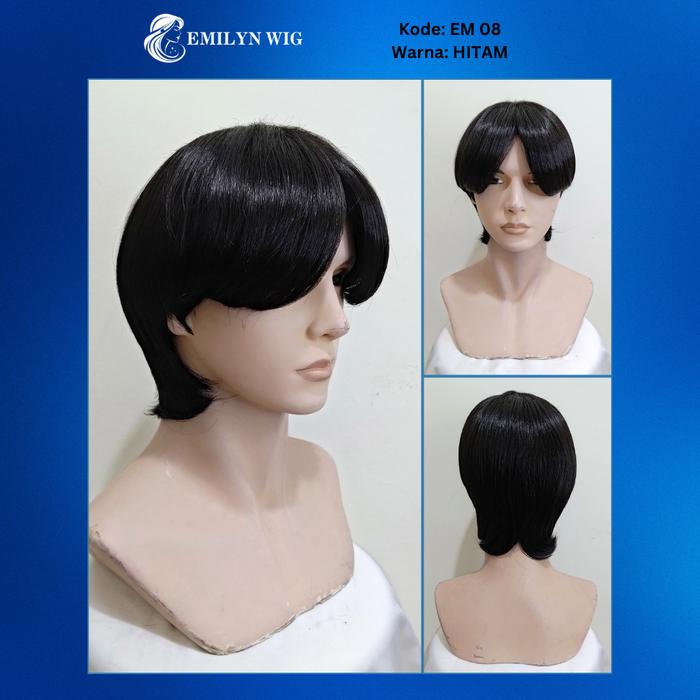 EM 08 Wig Model Mullet Poni Belah Tengah Kiri dan Kanan Rambut Palsu Pria Natural - Hitam