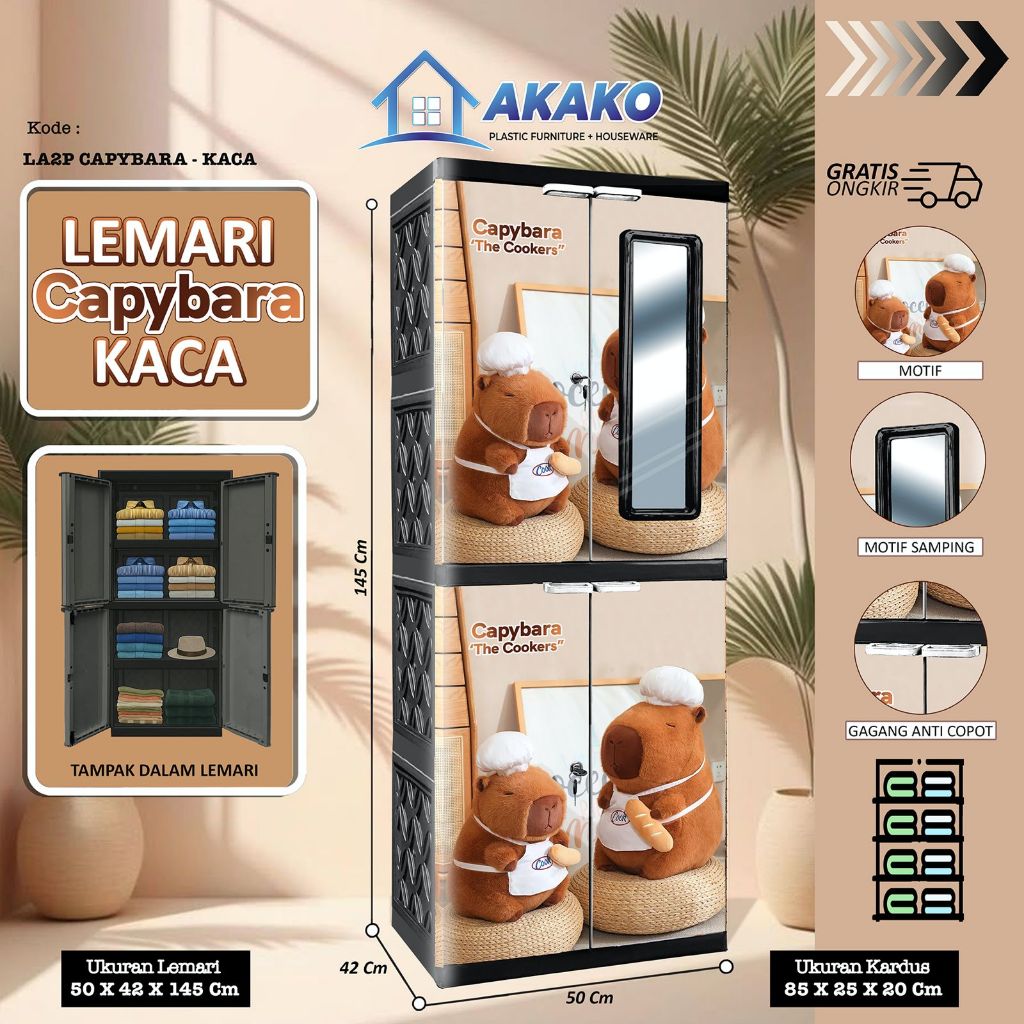 Akako Lemari Pakaian Baju plastik 2 pintu LA2P (CERMIN 1) 4 susun CERMIN KACA KARAKTER MOTIF BAGUS