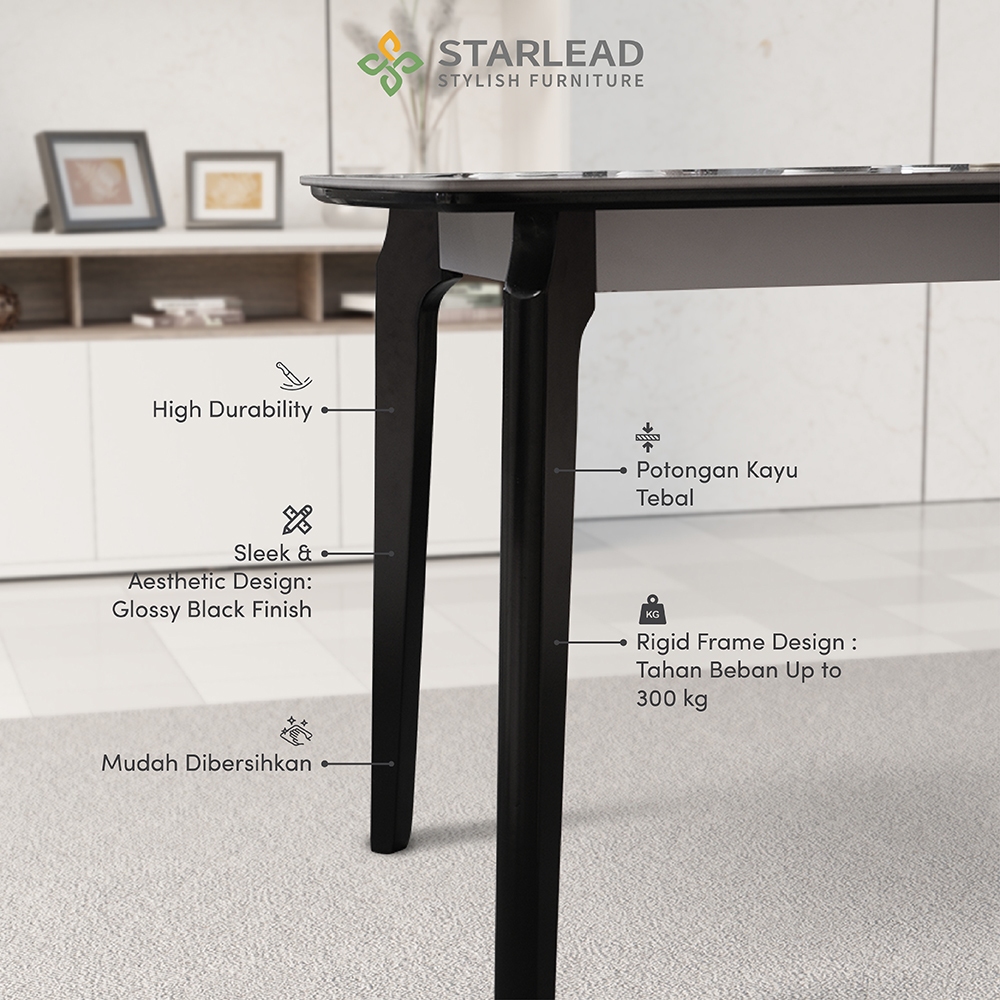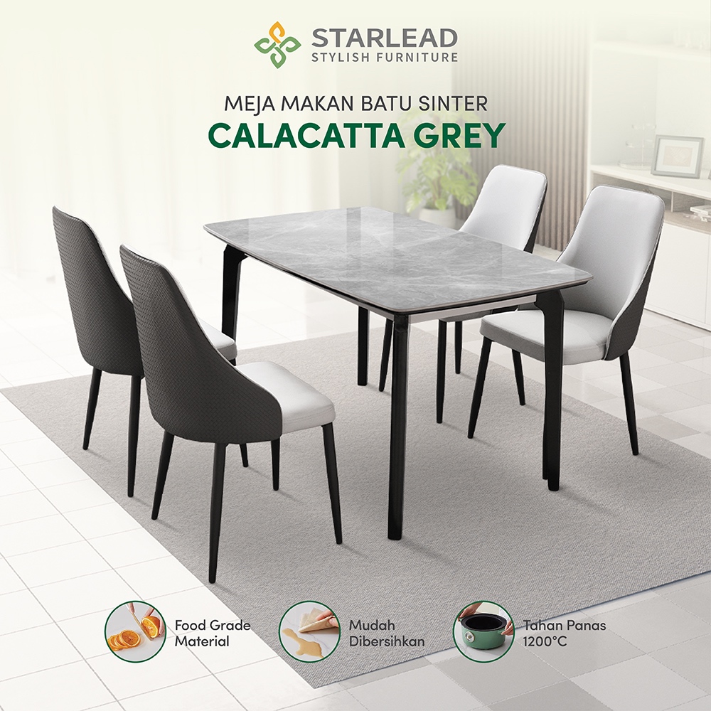 STARLEAD Set Meja Makan Batu Sinter / Meja Makan Kaki Kayu / Sintered Stone Dining Table - Carrara White / Callacata Grey