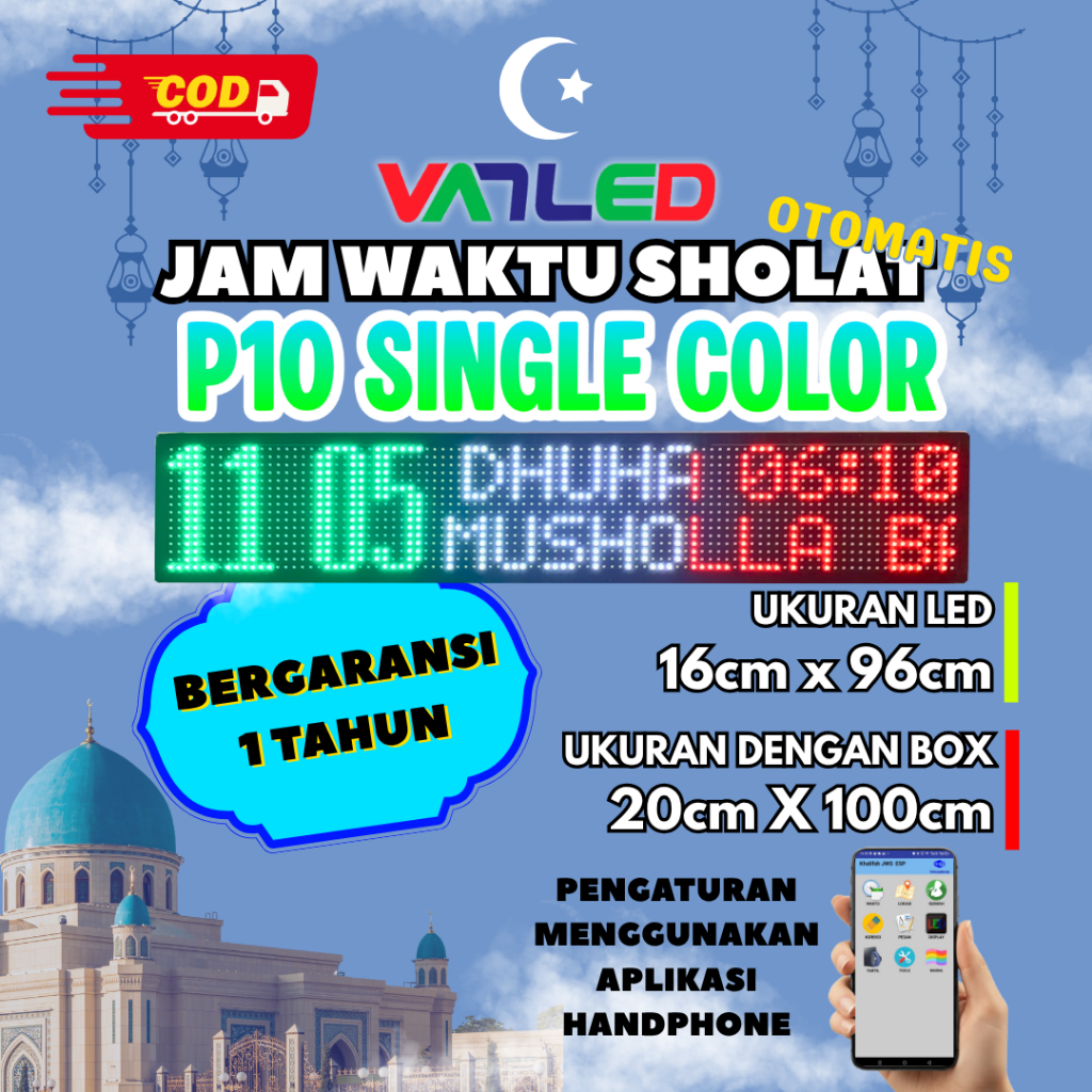 Jam Sholat Masjid Running Text JWS Jadwal Shalat Solat Digital Masjid P10 Merah Hijau Putih Single Color 16X96 Pixel 20X100 Cm Tartil Non Tartil