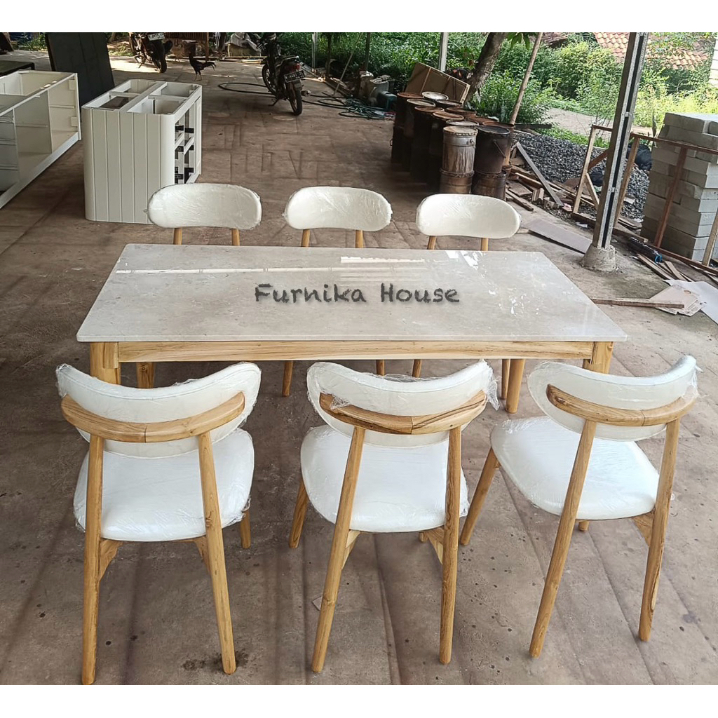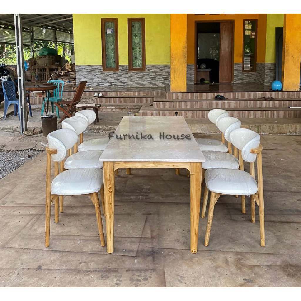 MEJA MAKAN KAYU JATI MARMER KURSI 4, KURSI 6, KURSI 8