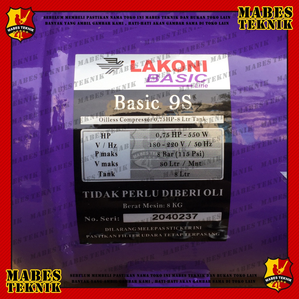 LAKONI BASIC 9S 3/4HP / LAKONI BASIC 9 S 0,75 - KOMPRESOR ANGIN LISTRIK / UDARA - OILESS / TANPA OLI - TANKI 8 LITER