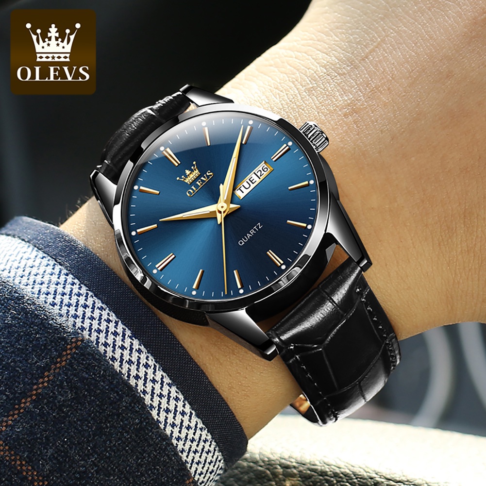OLEVS Jam Tangan Pria Anti Air Original Tahan Kulit Tali Laki Laki Cowok Analog Men Watch Hitam Biru Putih Model 6898