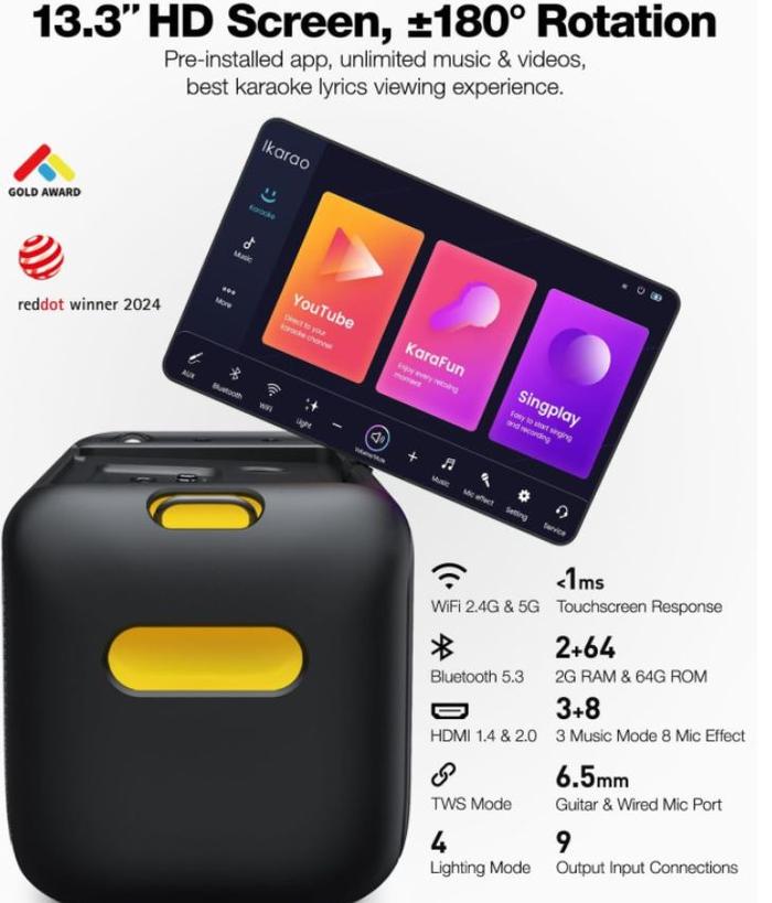 IKARAO Break X1 Premium Portable Wireless Audio Machine 1inch Smart Speaker Karaoke Bass Party Box