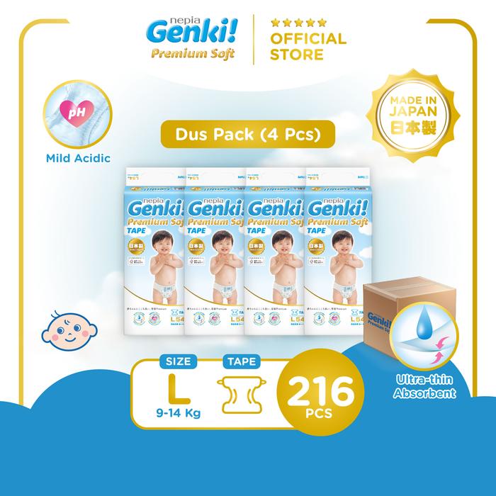 [Dus Pack] Nepia Genki Diapers Premium Soft Tape / Popok Bayi Perekat [9-14 kg] Ukuran L54 - 4 Pack