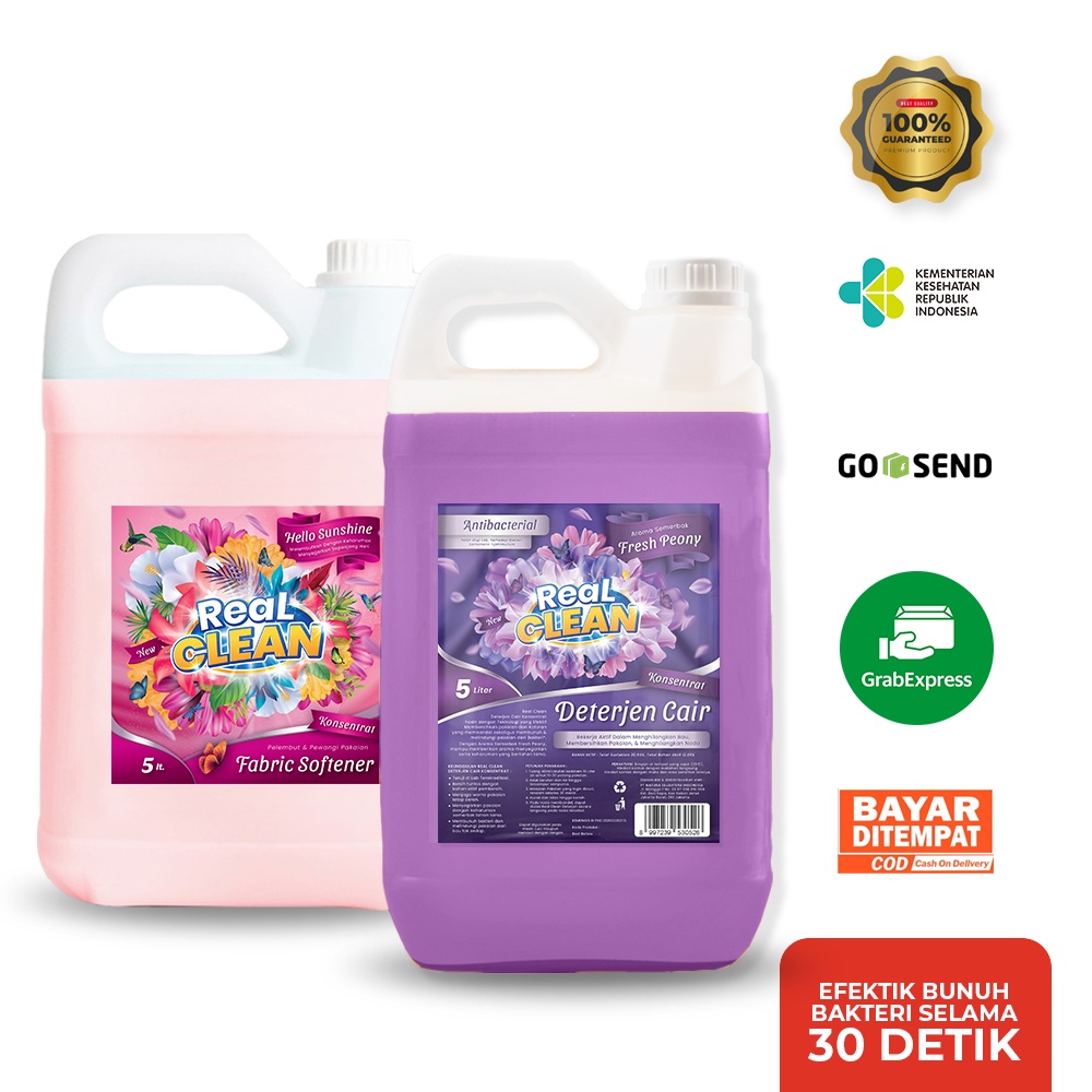 Real Clean Deterjen Cair laundry & Softener Cair PAKET HEMAT 10 Liter Sabun Cuci Pakaian & Pengharum Pelembut Pakaian
