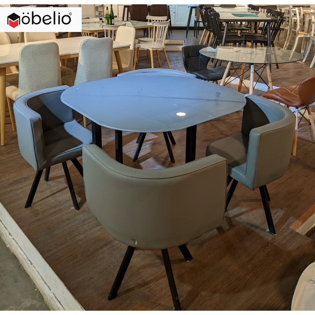 Mobelio - Meja Makan Dining Set Kaca Minimalis Box 4 Seater Kursi Bangku Abu abu Grey - SX