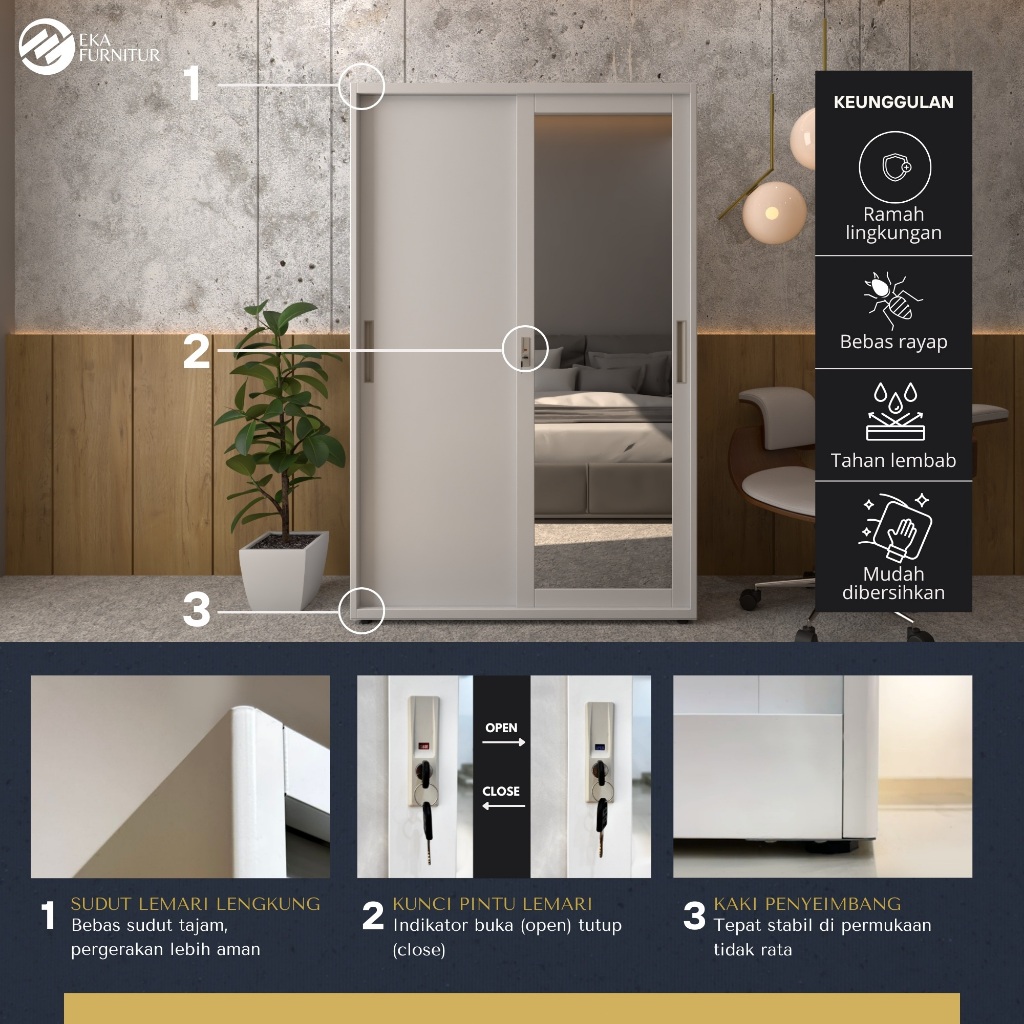 EKA 120cm Lemari Besi Sliding Pakaian 2 Pintu 1 Batang Rak Baju