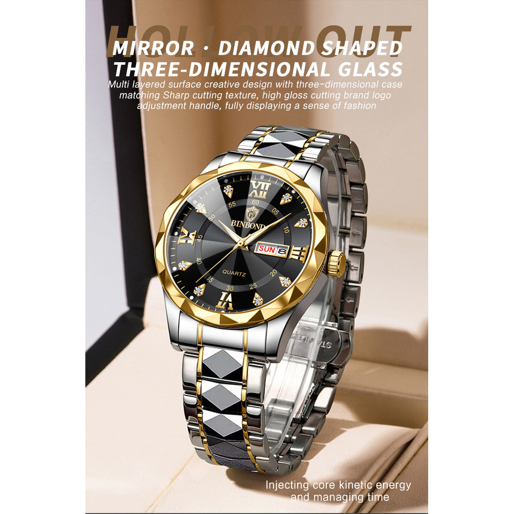 BINBOND Jam Tangan Kuarsa Modis Mewah Bermerek Teratas Jam Tangan Olahraga Tanggal Hari Kedap Air Pria Jam Tangan Kuarsa
