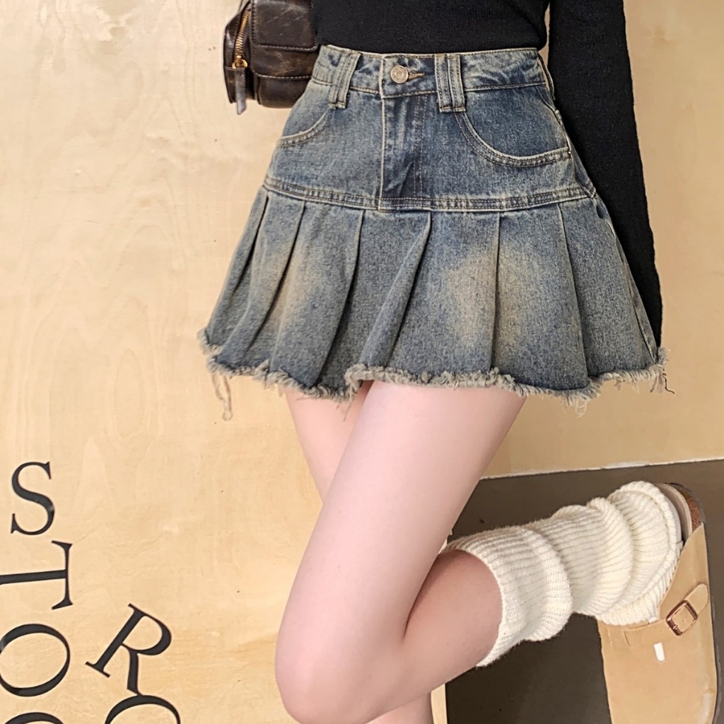 Rok Pendek Wanita JSROK-1901 Rok A-line Denim Lipit Highwaist Pinggang Tinggi Lipat Retro Hot Mimon Home