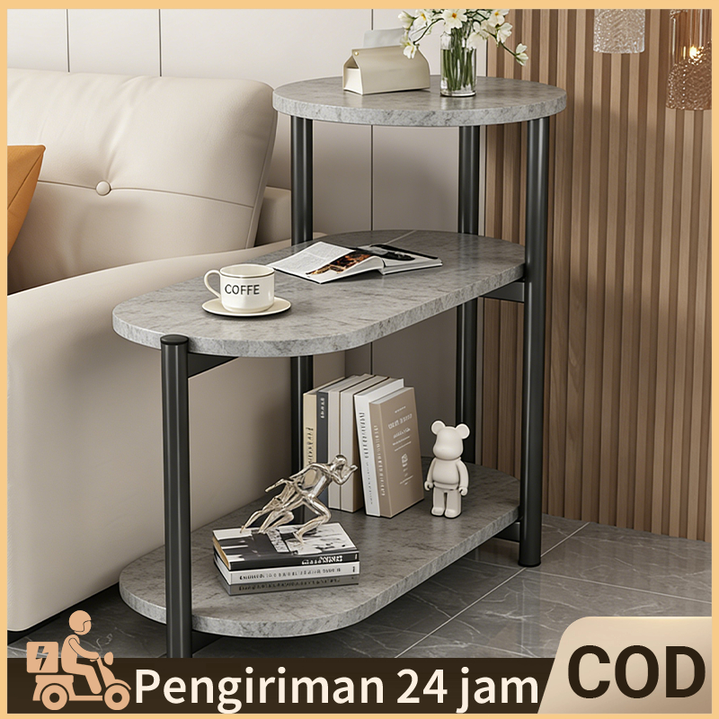 Meja samping sofa tiga tingkat sederhana dari marmer abu-abu, meja sudut ruang tamu multifungsi dari besi tempa hitam anti karat dan tahan benturan