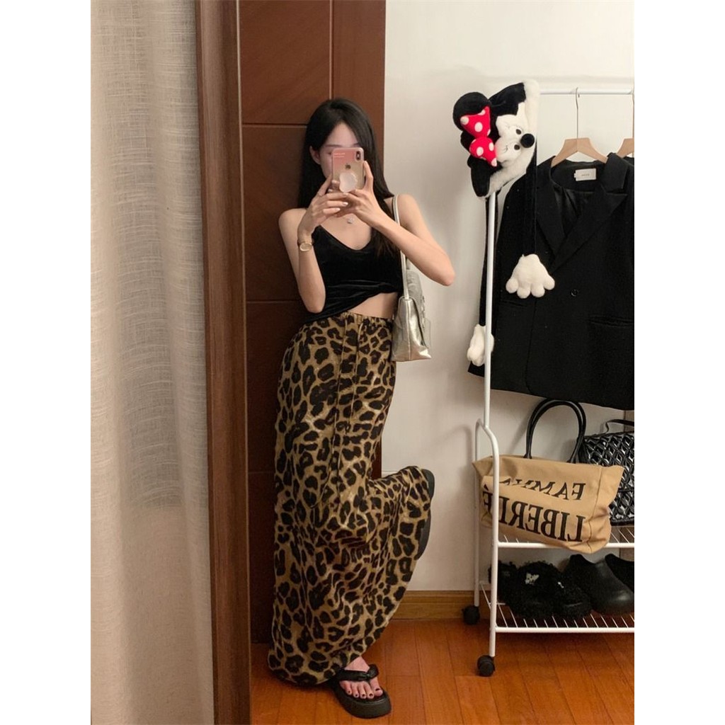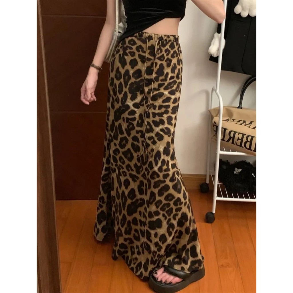 VELVANA Rok motif macan tutul retro rok maxi fishtail ramping pinggang tinggi baru pakaian wanita