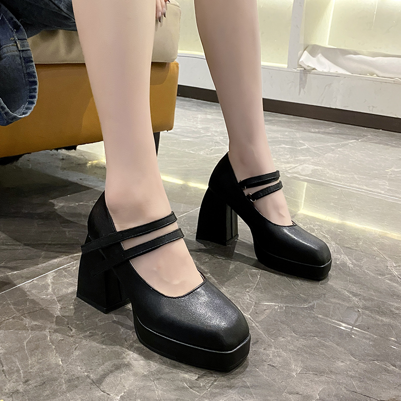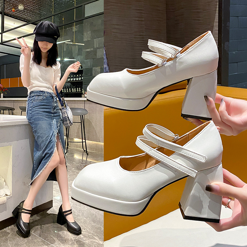 Sepatu High Heels Hak Tinggi Tahu Kerja Kantor Wanita Kekinian Korea Terbaru Import Murah Premium Hitam Putih Simple Sol Karet Strap Chunky Block Heels 12cm Big Size - Ukuran 35 36 37 38 39 40 41 42