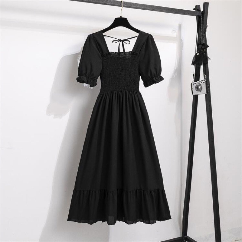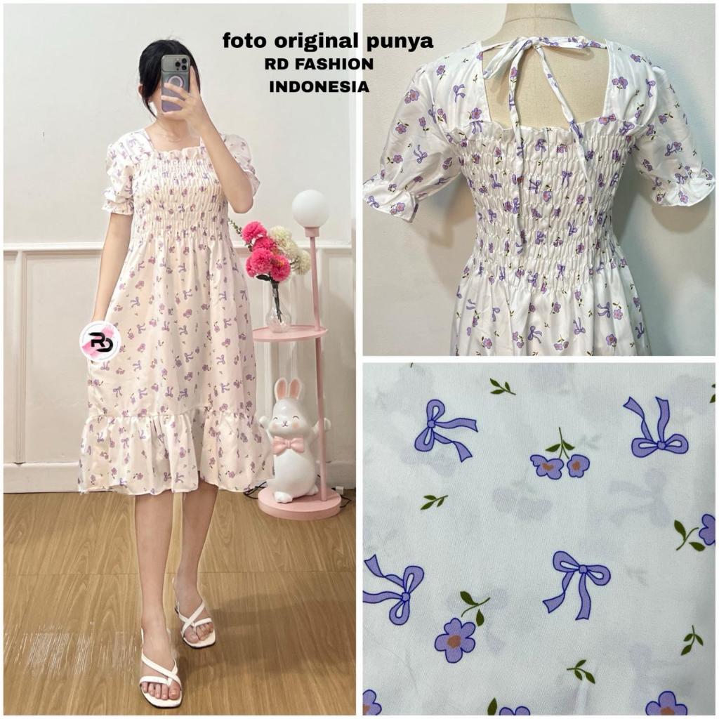 Gaun Musim Panas Kasual Baru Lengan Pendek Smocked Dress Lipit Bunga Dengan Dasi Belakang / Gaun Kasual A-Line Gaun Smoc