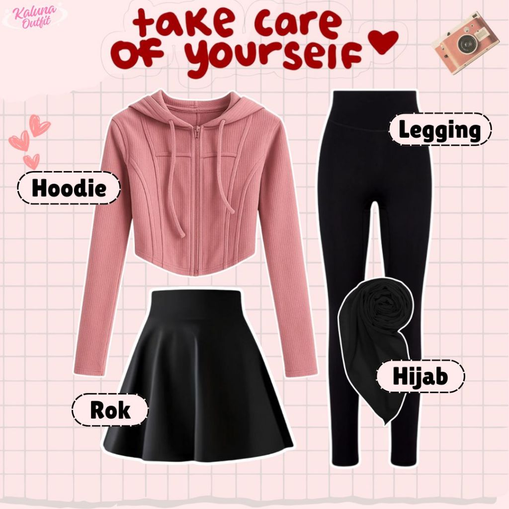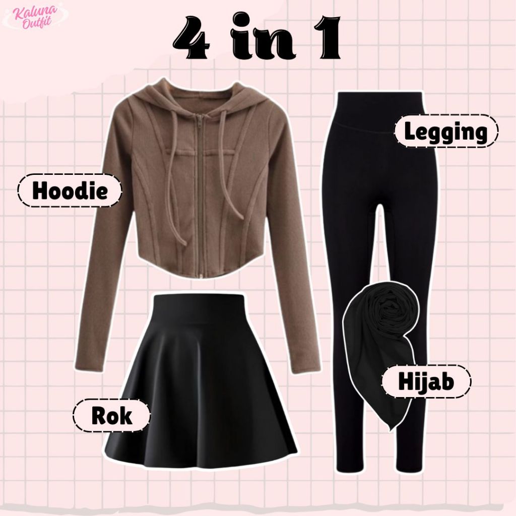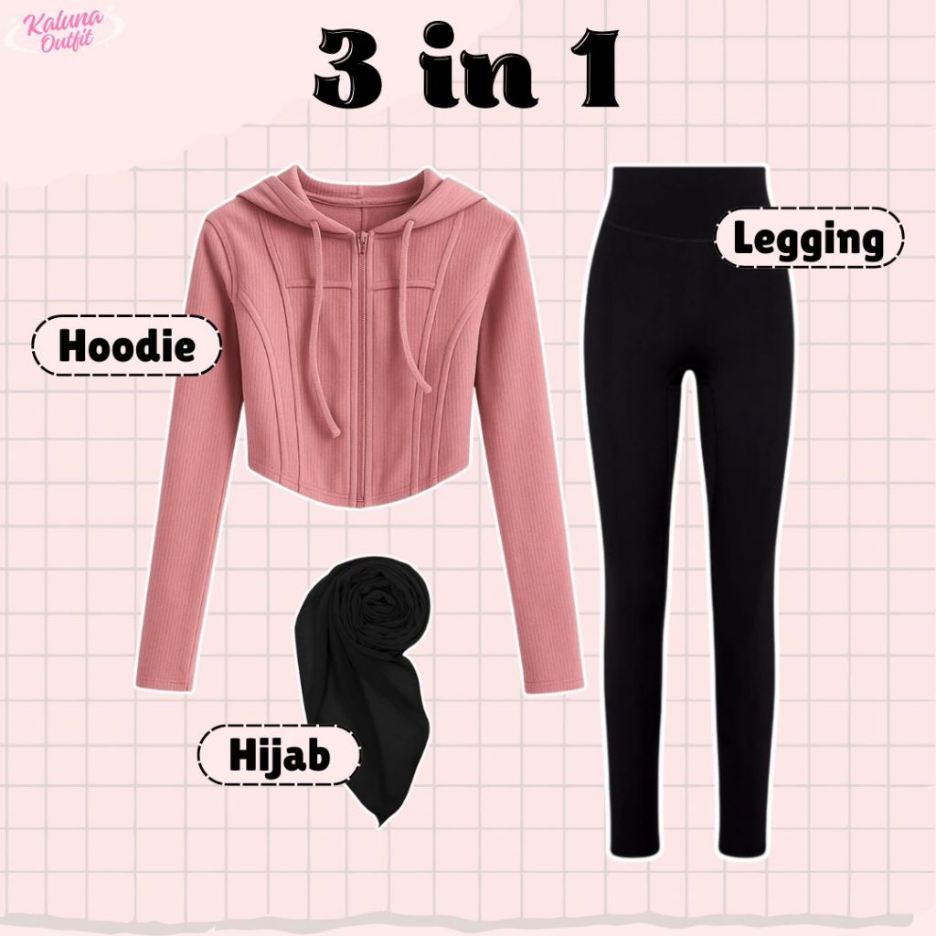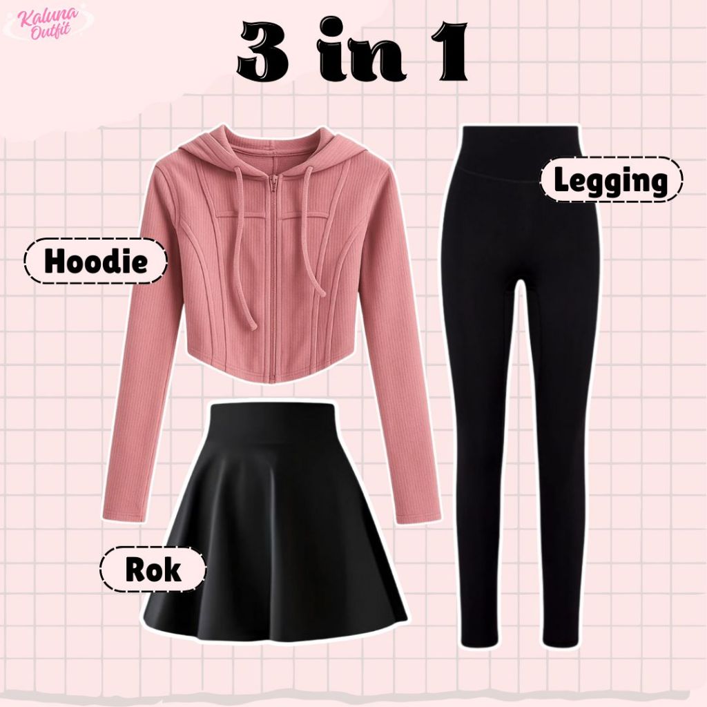 One Set Olahraga Wanita Hoodie Crop Rib Knit, Rok Mini, Celana Legging, Bella Square Setelan Outfit Sporty Kekinian OOTD