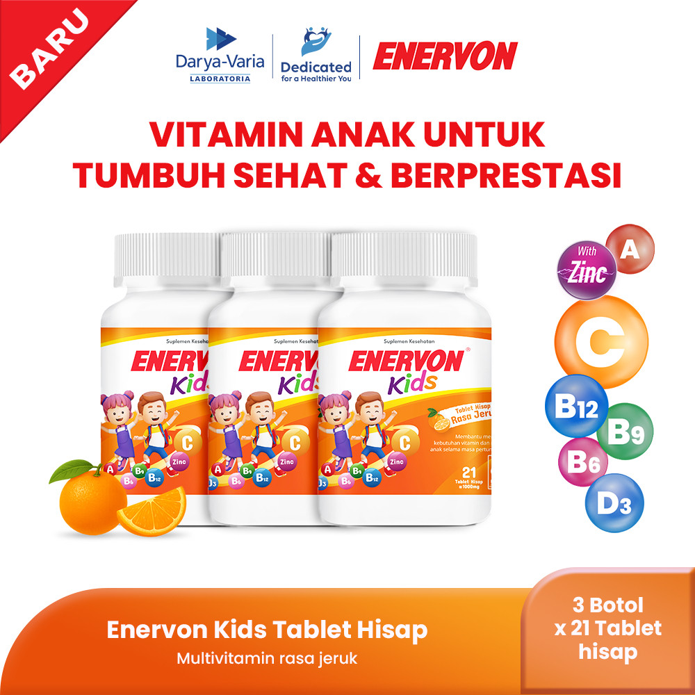 Enervon Kids Tablet Hisap Rasa Jeruk ( 3 Botol X 21 Tablet) - Multivitamin Suplemen Kesehatan-Vitamin C, A, B Complex, D