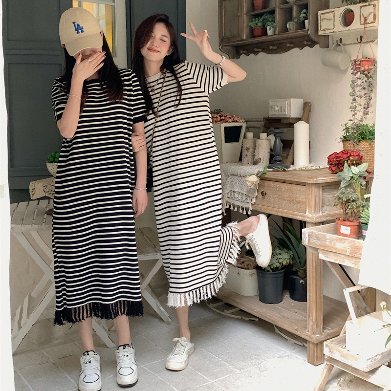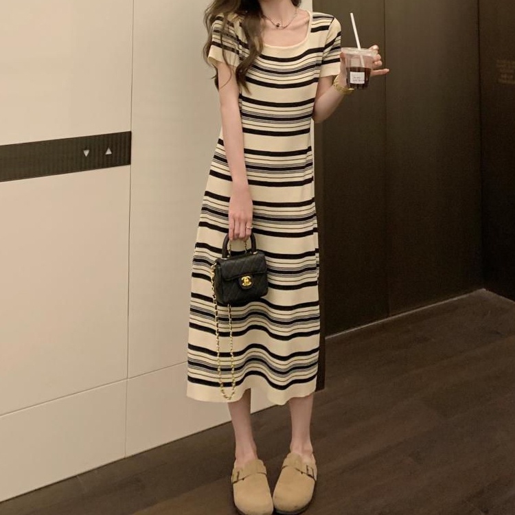 yikoo-Maxi dress gaun panjang bergaris dengan rajutan korea dres wanita
