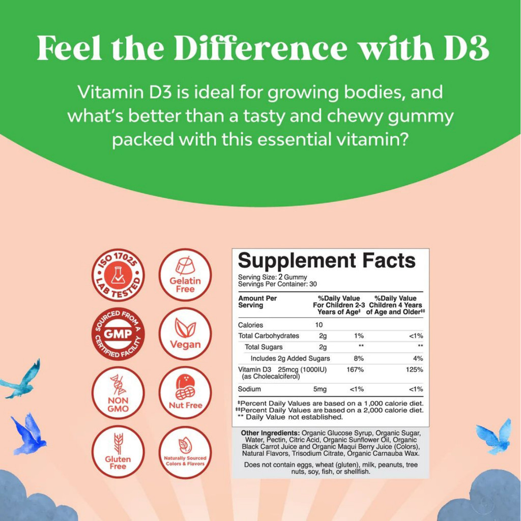 Kids Vitamin D3 Organic Gummies 1000Iu Vegan Kids Immunity Support Gummies With Vitamin D For Kids Daily Teeth Muscle &