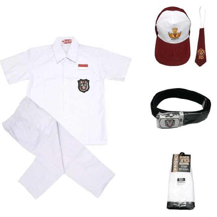 SETELAN SERAGAM SEKOLAH SD PUTIH PUTIH LAKI-LAKI LENGAN PENDEK CELANA PANJANG SUPER KOMPLIT KELAS 1-6 SD - SET KOMPLIT TOPI MERAH, 7 TAHUN