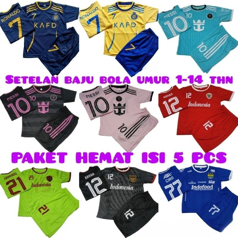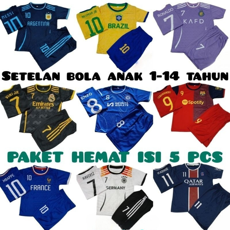 TERMURAH COCOK BUAT USAHA PAKET HEMAT ISI 5 PCS jersey setelan baju bola anak terbaru umur 1 -14 tahun kualitas premium