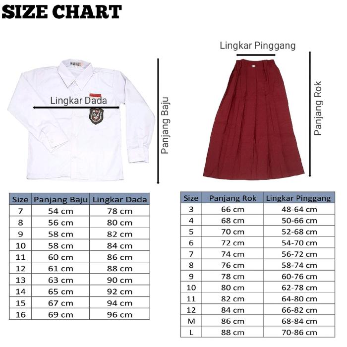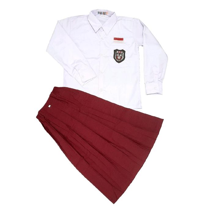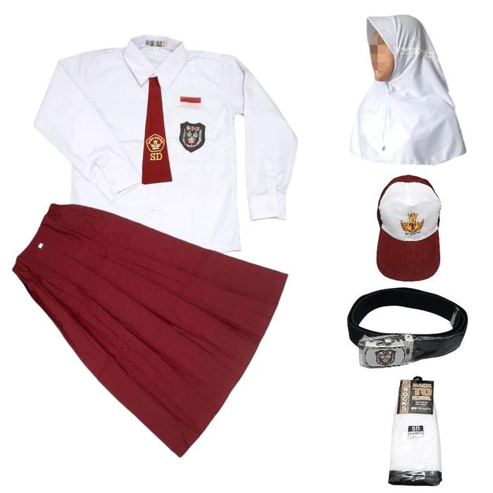 SERAGAM SD MERAH PUTIH PEREMPUAN BAJU PANJANG ROK PANJANG - HIJAB KOMPLIT TOPI MERAH, 7 TAHUN