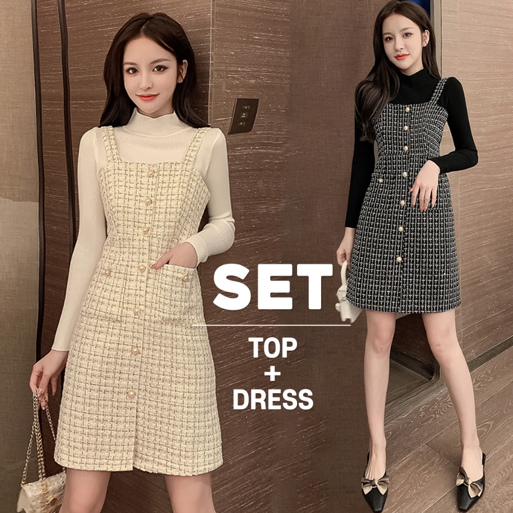 KARAKOREA 5568 Premium Tweed Dress Set Rok Terusan plus Baju Dress Korean style setelan wanita one set import baju satu
