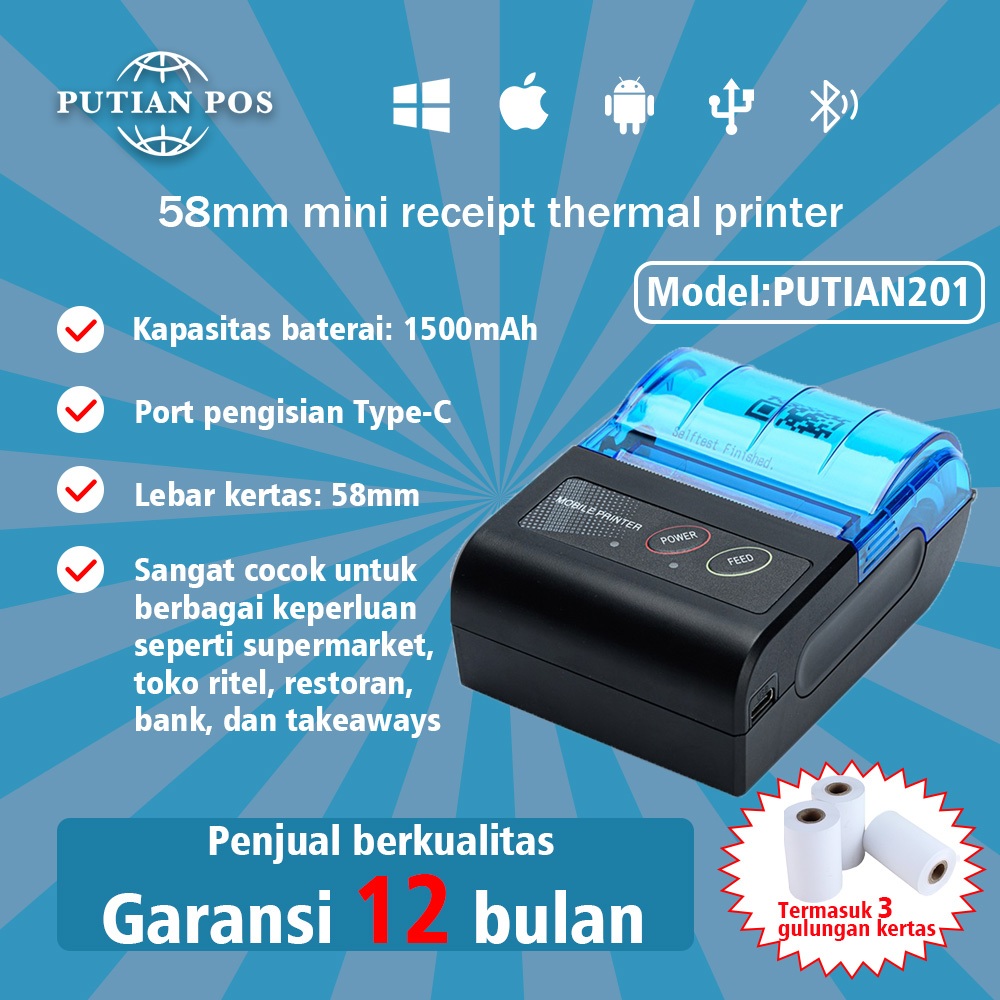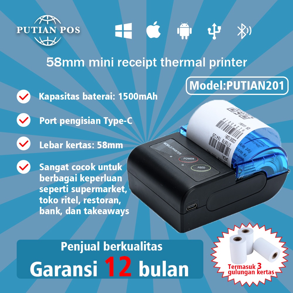 Putian Pos Printer Portabel 58Mm Bluetooth Printer Putian201 Mesin Cetak Kasir (Dengan Baterai)