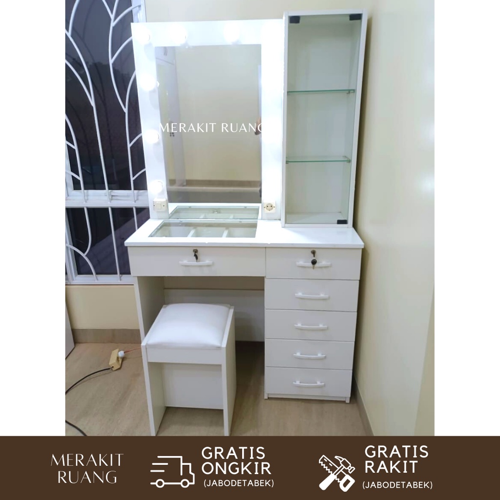 Meja Rias Premium Vanity Mirror Terang 5 Laci Plus Satu Dengan Rak Kaca Make Up Elegan, Murah