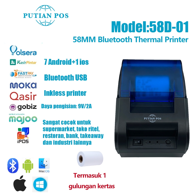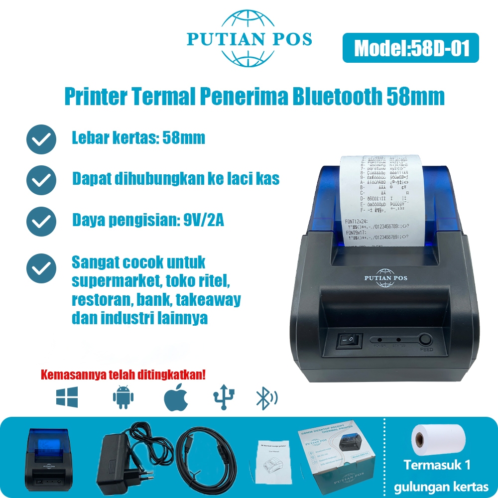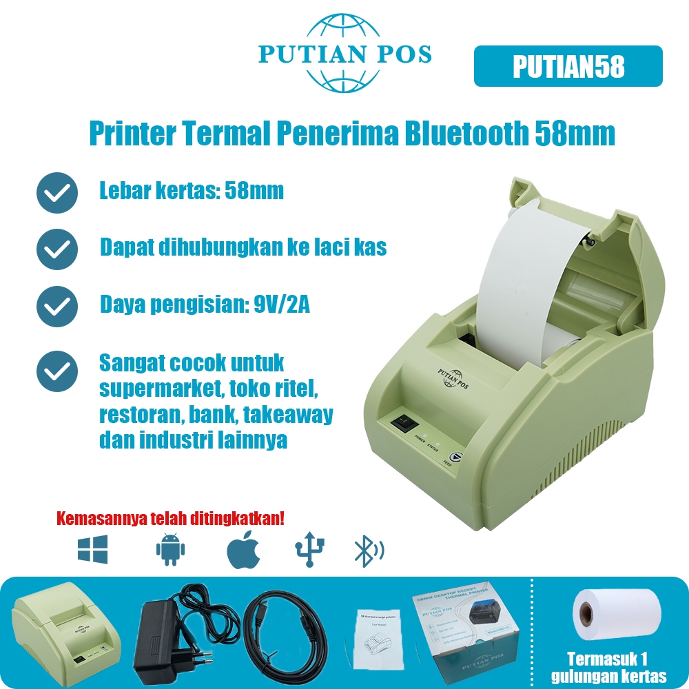 Putianpos Printer Thermal Bluetooth Usb 58Mm, Rpp02N Printer Kasir Pos Support Cash Drawer