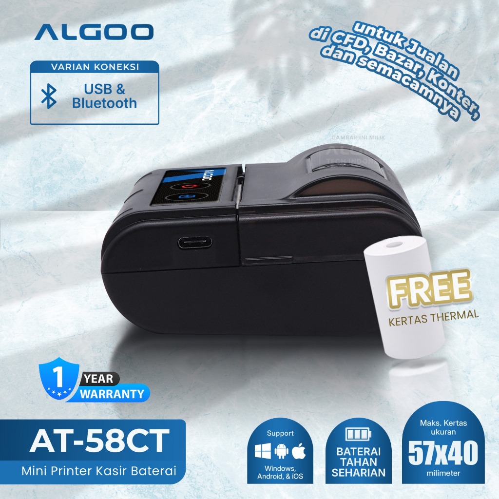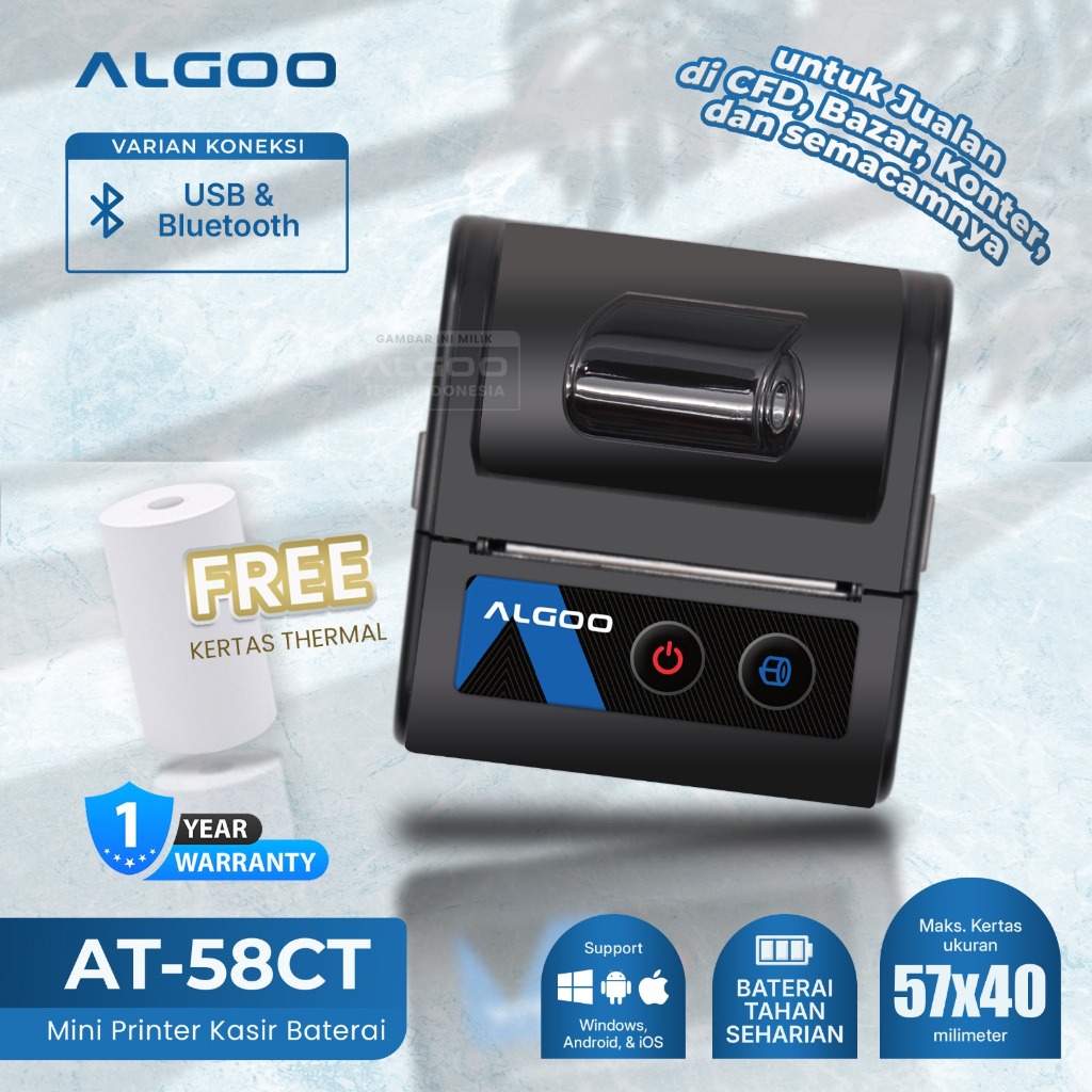Algoo At-58Ct Printer Thermal Bluetooth 58Mm Struk Nota Tanpa Tinta